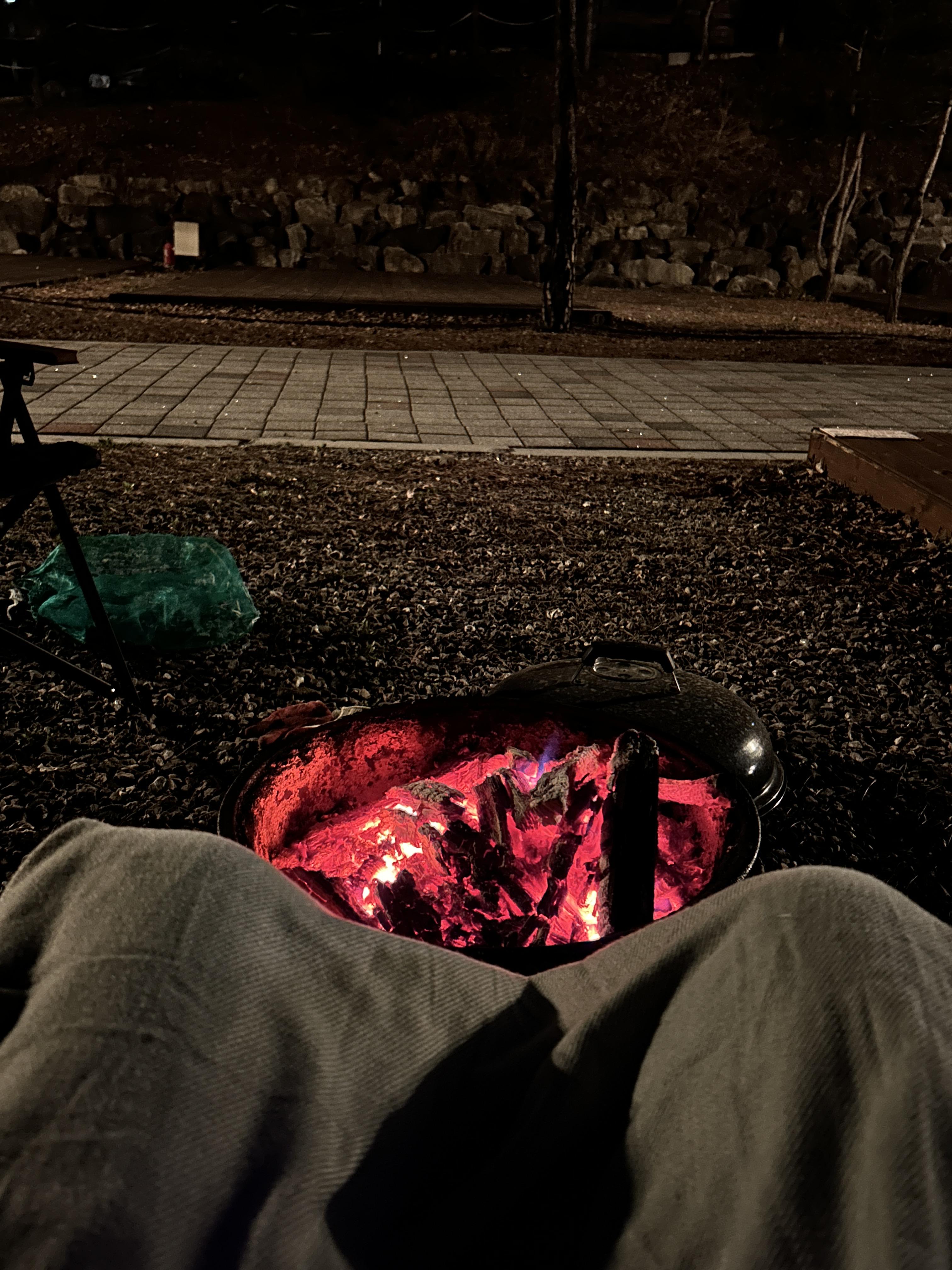 이어지는 불멍타임. 장작 사놓고 정작 화로대는 놓고 와서 급하게 캠핑장에서 빌림(무료). 화로대를 놓은 파쇄석은 옆 사이트 주차 자리인데 사이트도 비었고 사장님이 먼저 편하게 쓰라고 하셔서 불멍존으로 썼다.
