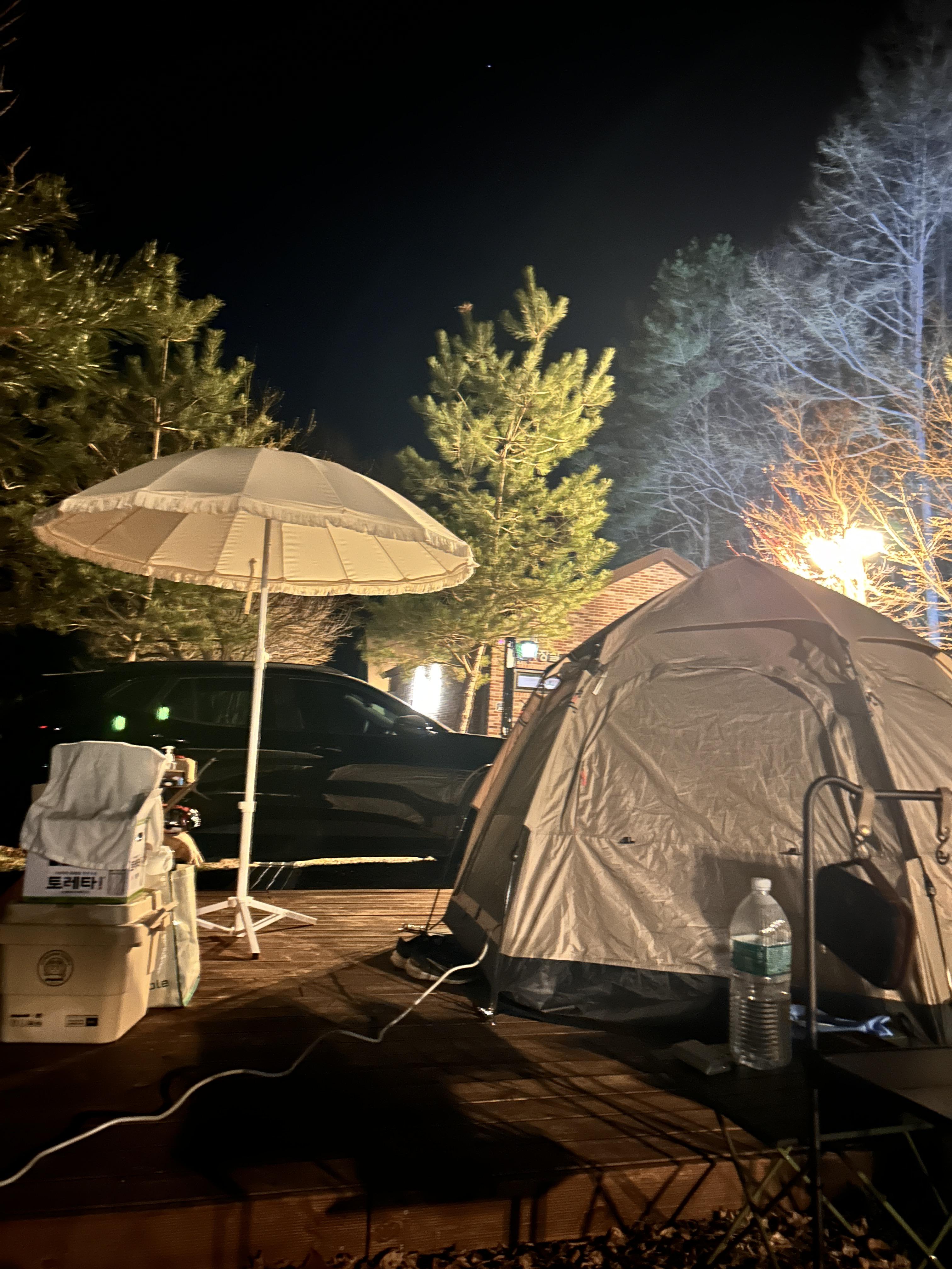 밤에 다시 찍어본 우리 사이트. 갬성치트키 파라솔을 두고도 난민캠이 따로 없음. 참고로 저 파라솔은 오는 길에 캠핑장 전시품을 싸게 팔길래 삼. 원래 사고 싶었던 제품인데 2만원으로 득해서 개이득!