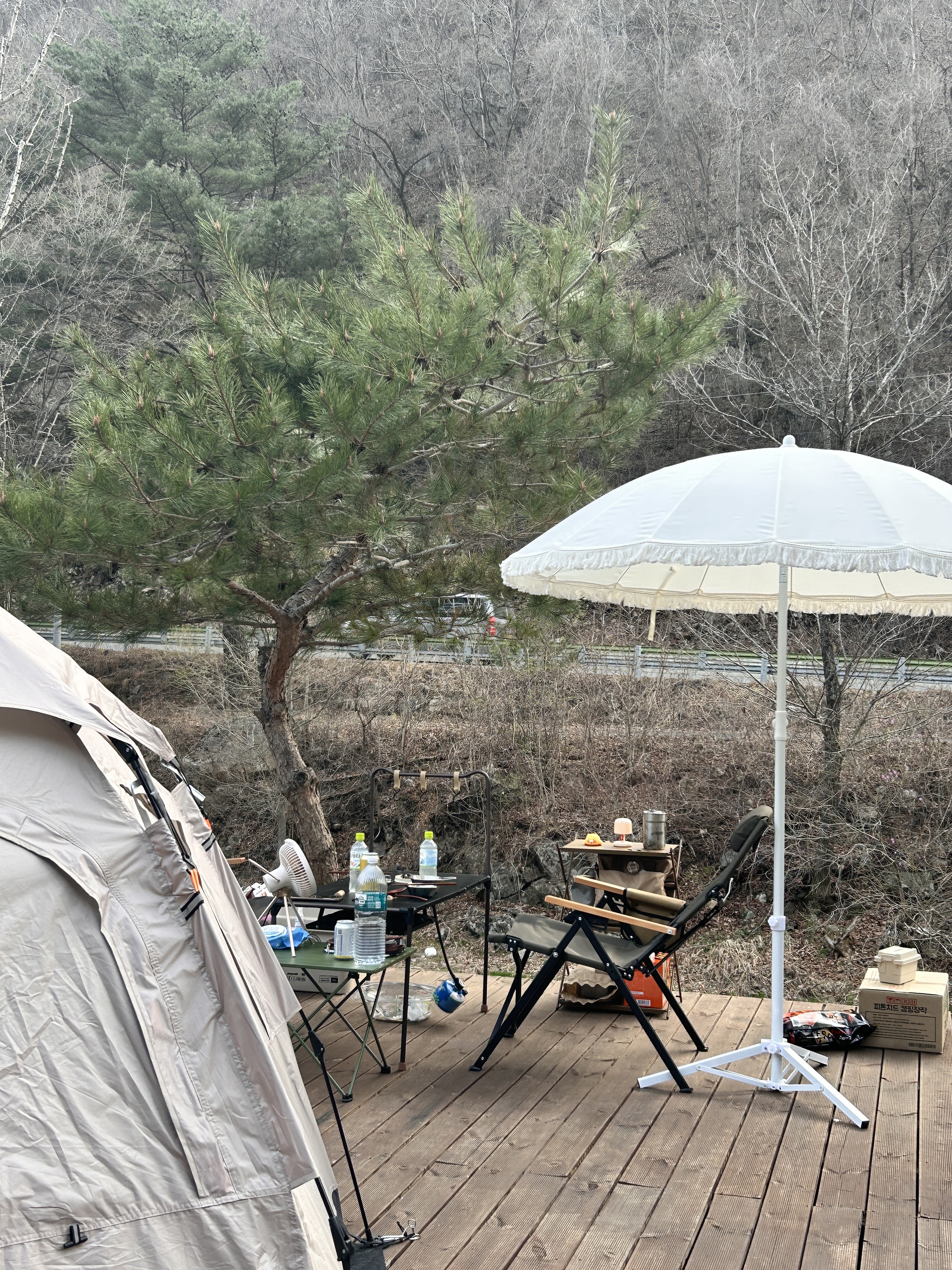 계곡 너머로는 도로가 보인다. 캠핑장에서도 가장 단촐한 우리 사이트. 이제 봄이니 리빙쉘대신 원터치를 가지고 다니는데 좀 없어보이는 것 빼고는 정말 좋다.