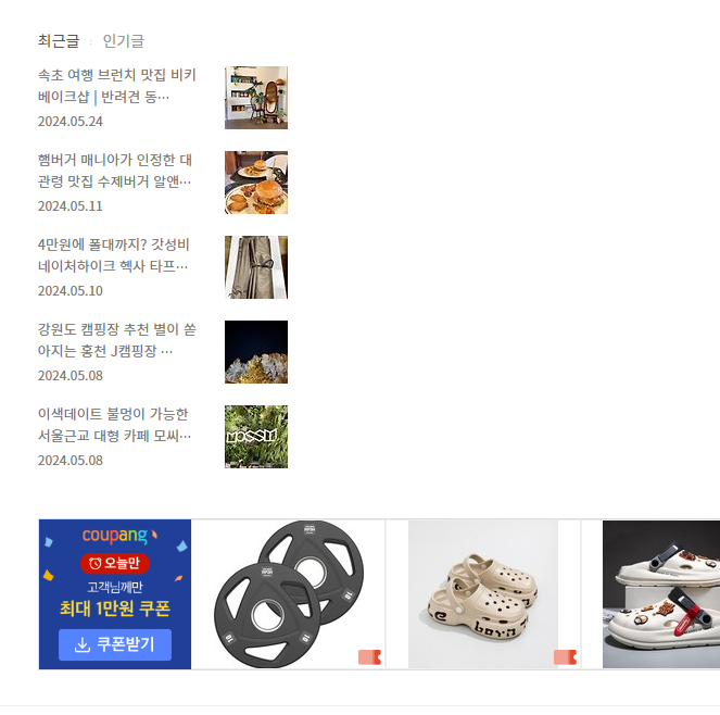 쿠팡 파트너스 광고가 뜬 것을 확인할 수 있습니다. 여기까지 따라오느라 수고 많으셨어요 : ) 쉽게 쿠팡 파트너스 배너 붙여 넣고 수익화 블로그 만들어보아요.