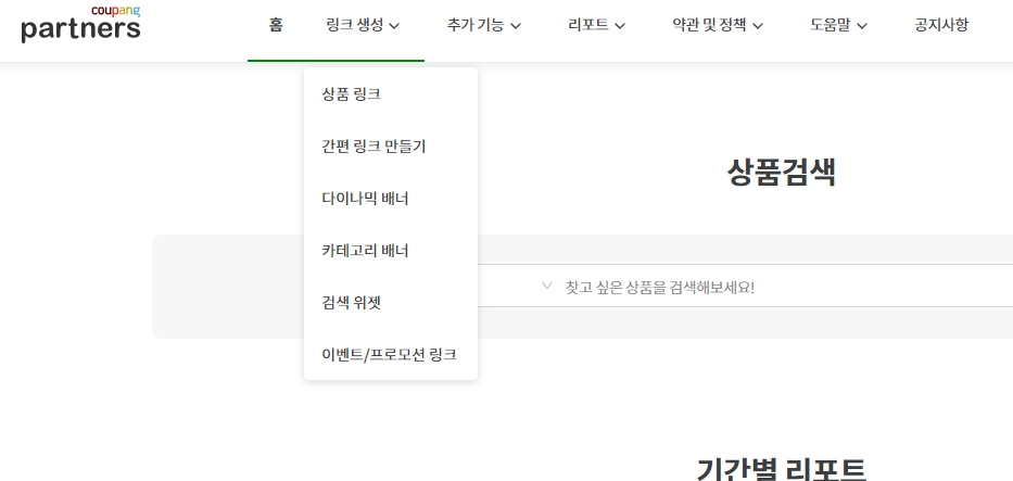 2. 가입 후 상단의 [링크생성] 위에 커서를 대면 목록이 보이는데요, 여기서 [다이나믹 배너]를 클릭해 줍니다.