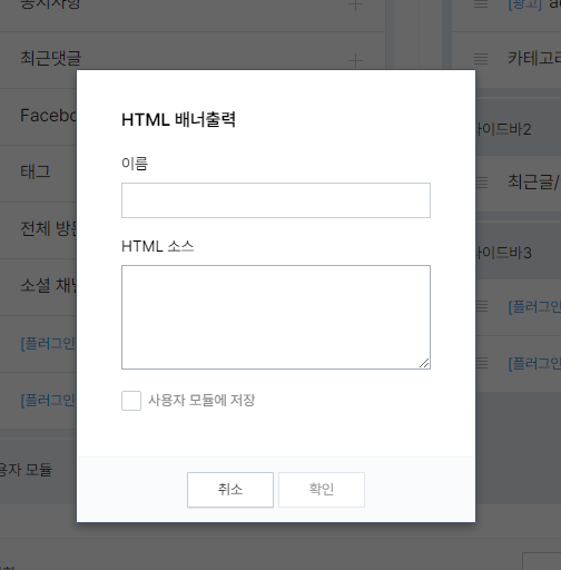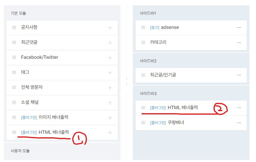 그리고 [HTML 배너출력]의 +를 눌러 사이드바 3에 추가한 뒤,