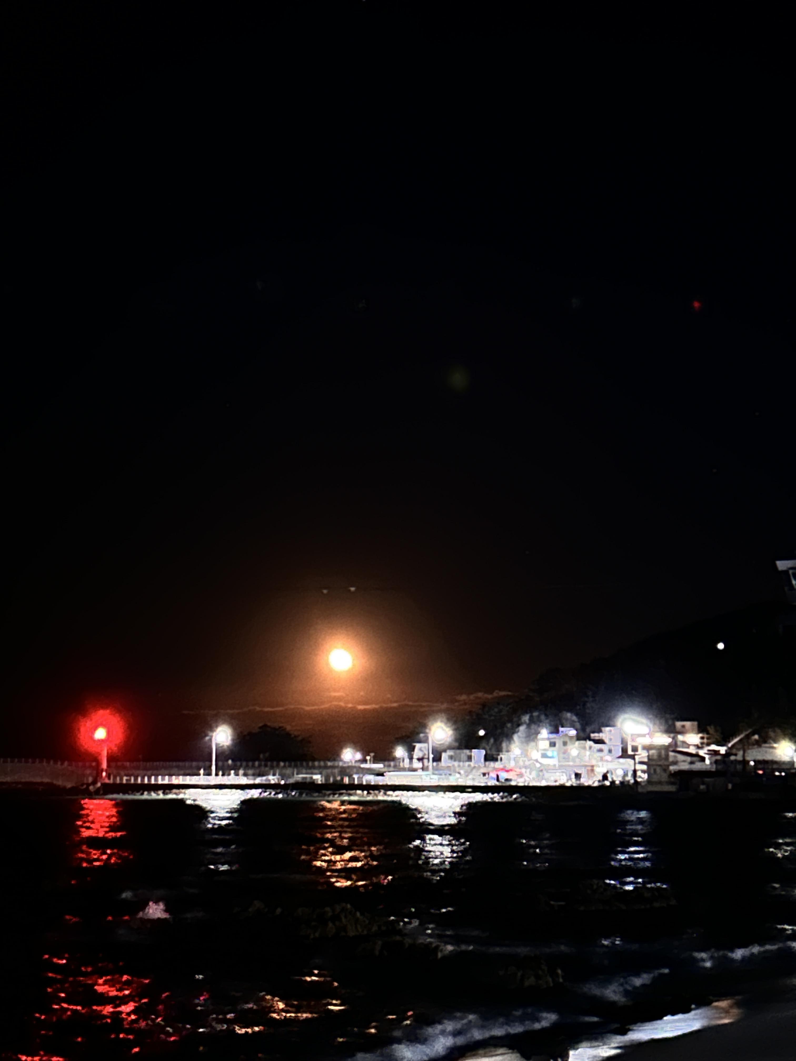 밤 바다를 살짝 거닐어 본다. 가장 큰 노란 불빛이 달이었다. 낮게, 그리고 엄청 크게 떠있던 달. 아이폰의 밤 화질이 아쉬웠던 순간.