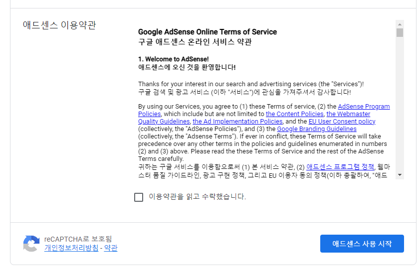 처음 구글 애드센스에 접속한다면 가입 절차를 거쳐야 하는데요. 첫 화면에서 시작하기를 누르고,