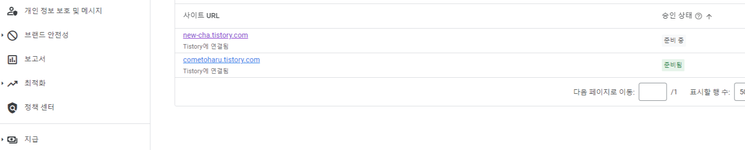 그리고 다시 아까의 구글 애드센스로 들어와 [다음]을 눌러주면 됩니다. 그리고 구글 애드센스의 [사이트] 메뉴로 들어가면 새로운 블로그가 리스트에 추가된 것을 확인할 수 있어요.