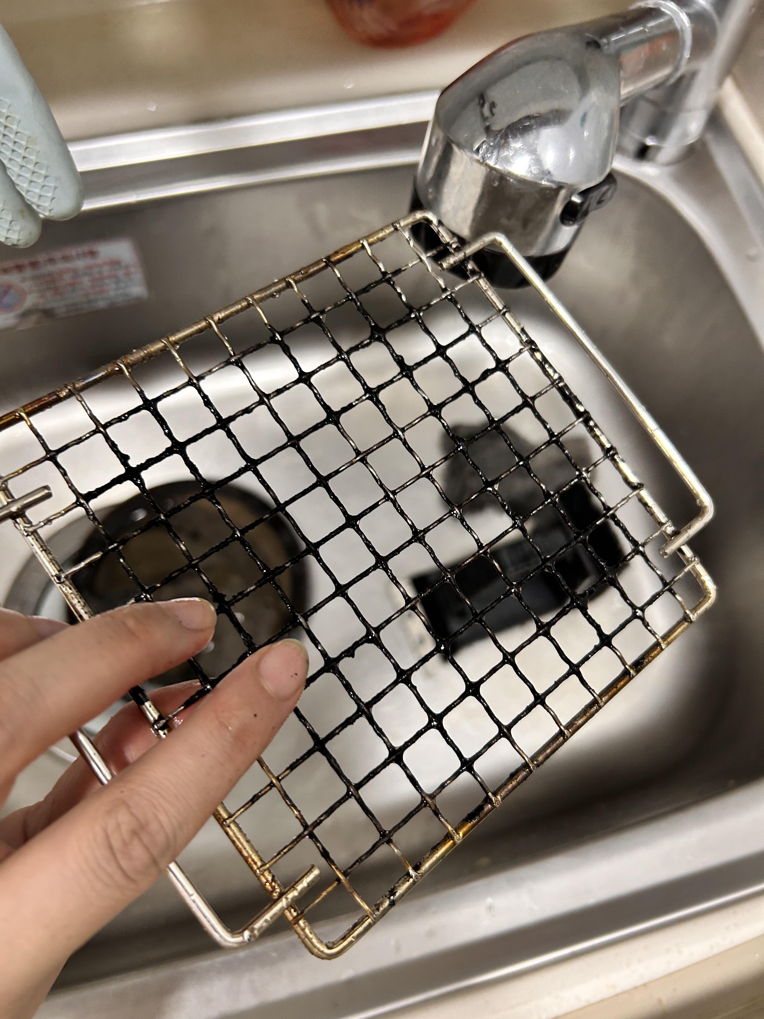 시커멓게 고기 기름이 달라붙어 회생이 불가능해보이는 캠핑 화로대 전용 그릴