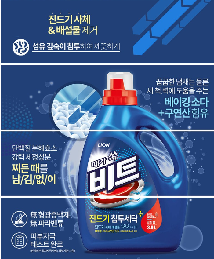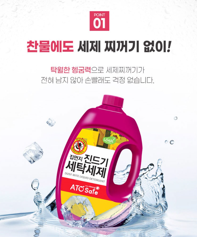 이 제품은 라이온코리아에서 제조한 세탁세제로, 보이지 않는 진드기 사체와 배설물까지 깔끔하게 제거해주는 강력한 세정력을 자랑하는데요. 단백질 분해 효소와 강력한 세정 성분이 포함되어 있어서 다양한 오염과 찌든 때를 효과적으로 제거해준답니다.