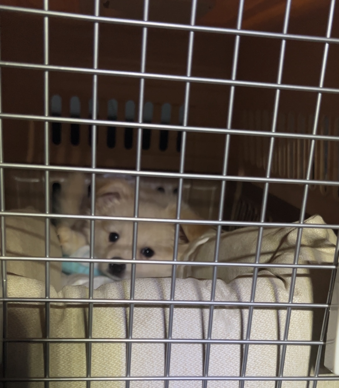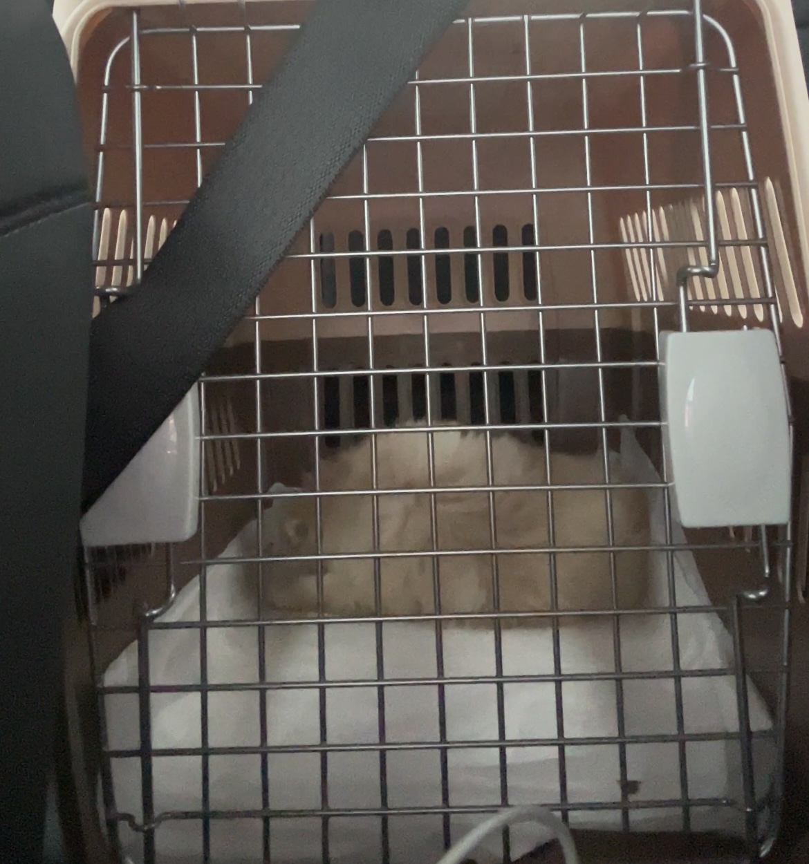 집으로 오는 길. 배변패드만 깔아져 있고 켄넬이 너무 커서 불편해보였다.
